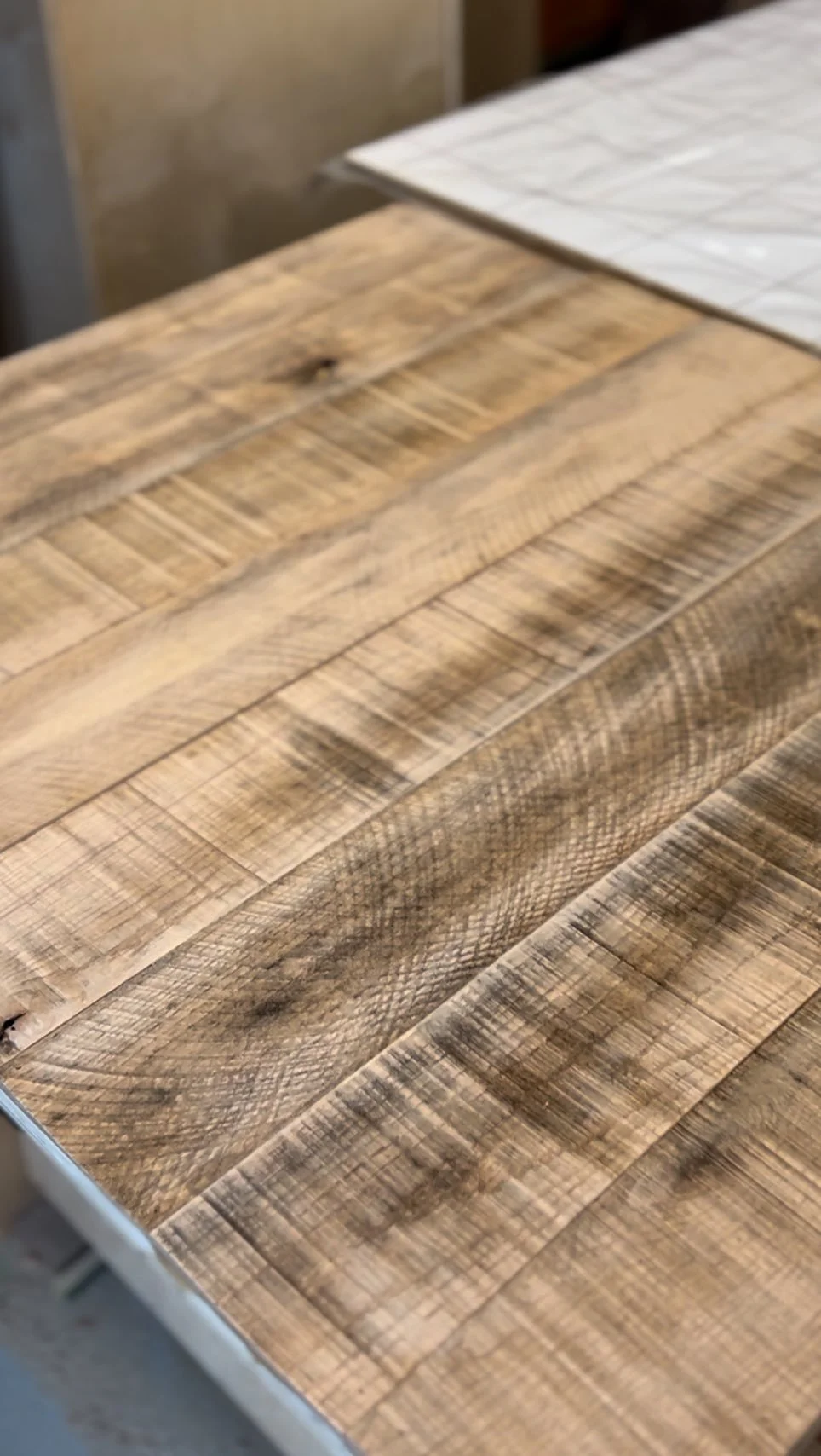 An 11' display table made custom for Moore and Giles. Made from reclaimed oak beams from a early 1900 barn in Bedford, VA.