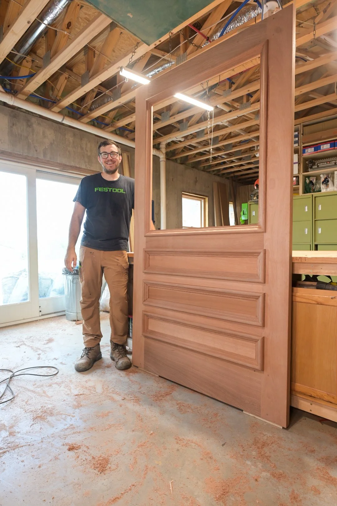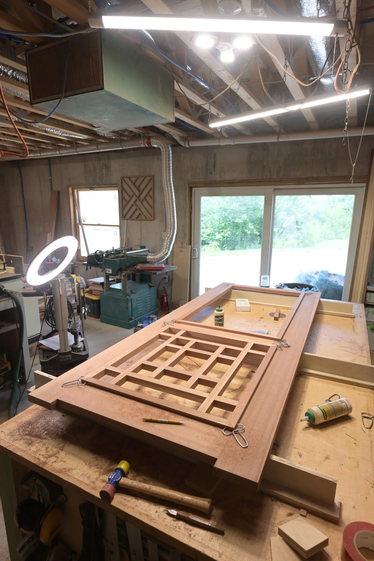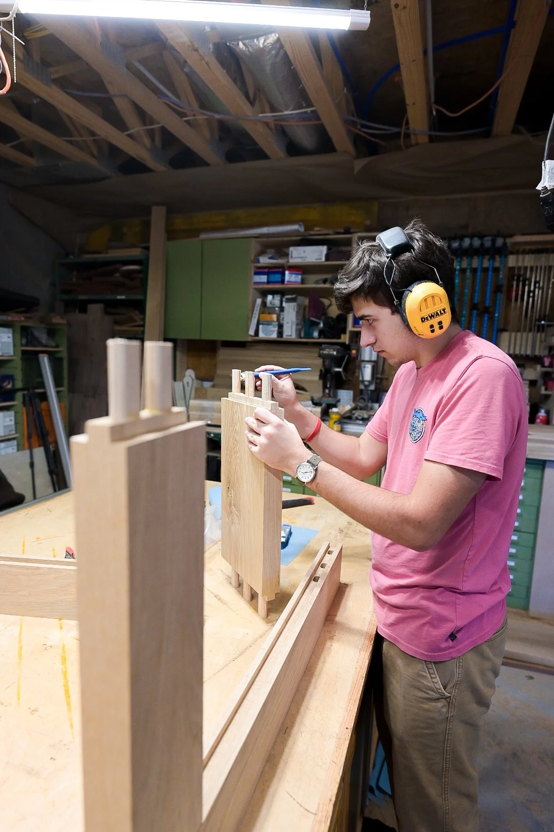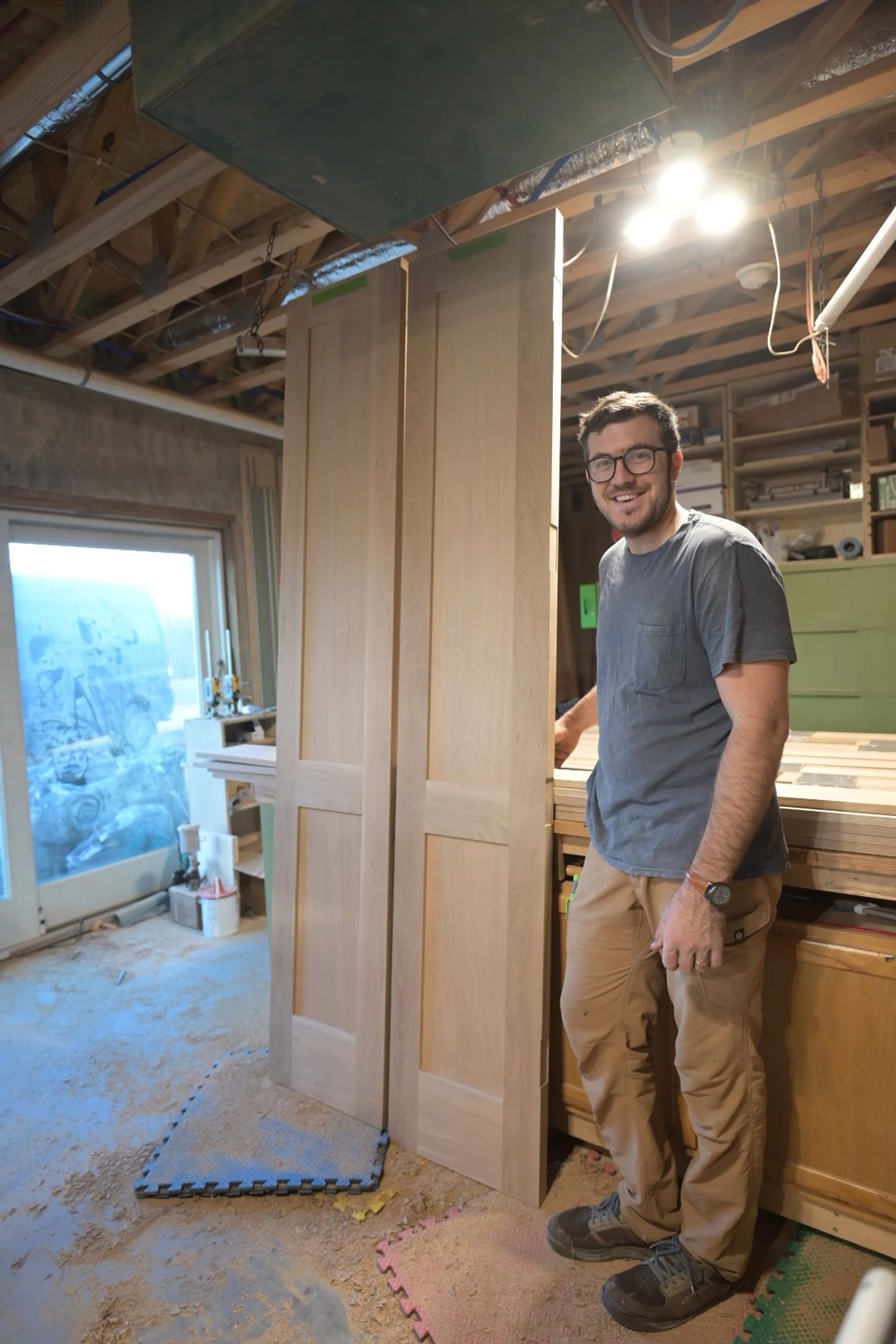 Ethan is placing glue on the tenons on a small access door on a recent project.