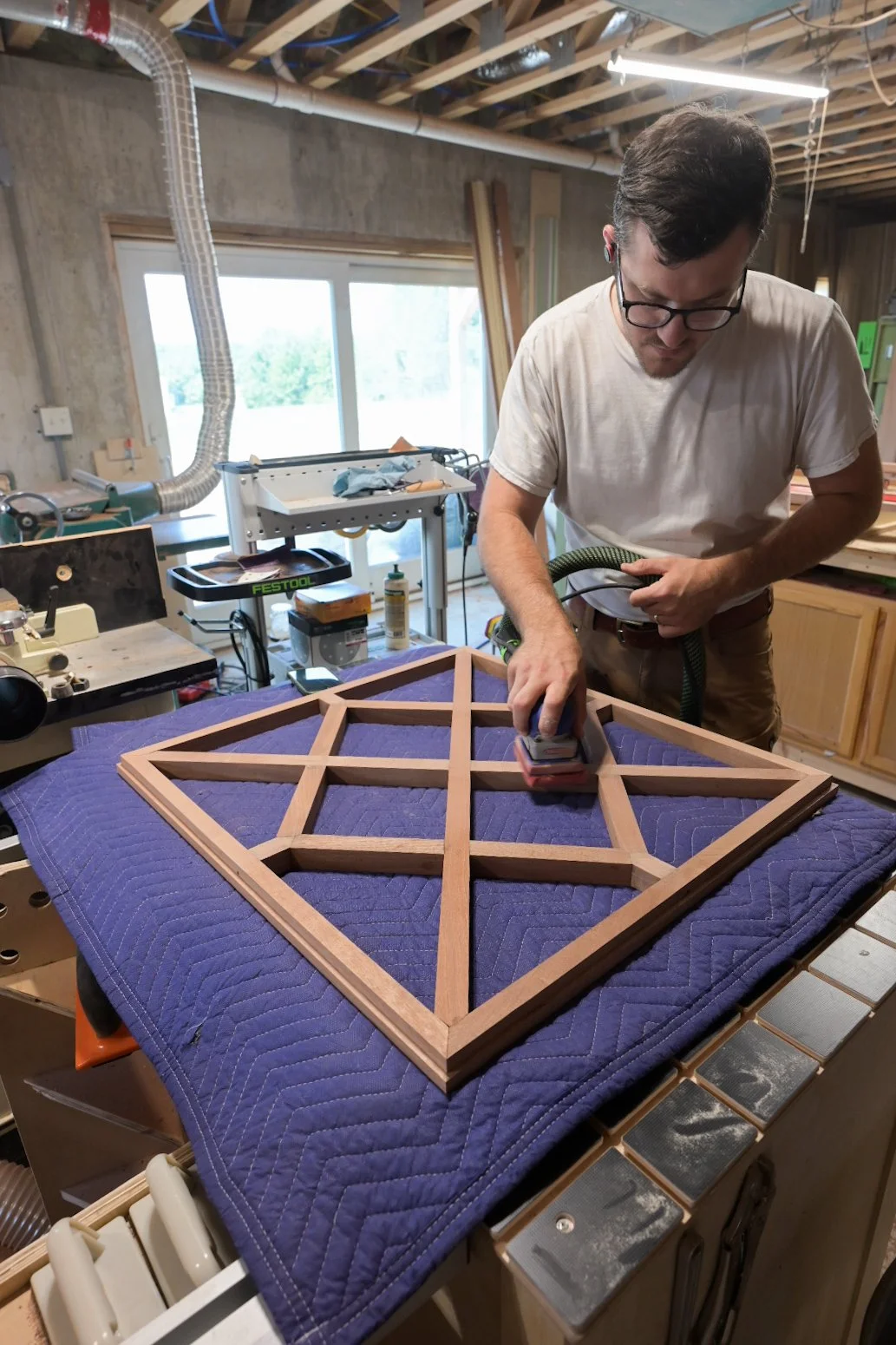 Sanding the "Shirley" Chippendale design before inserting it into the screen door.